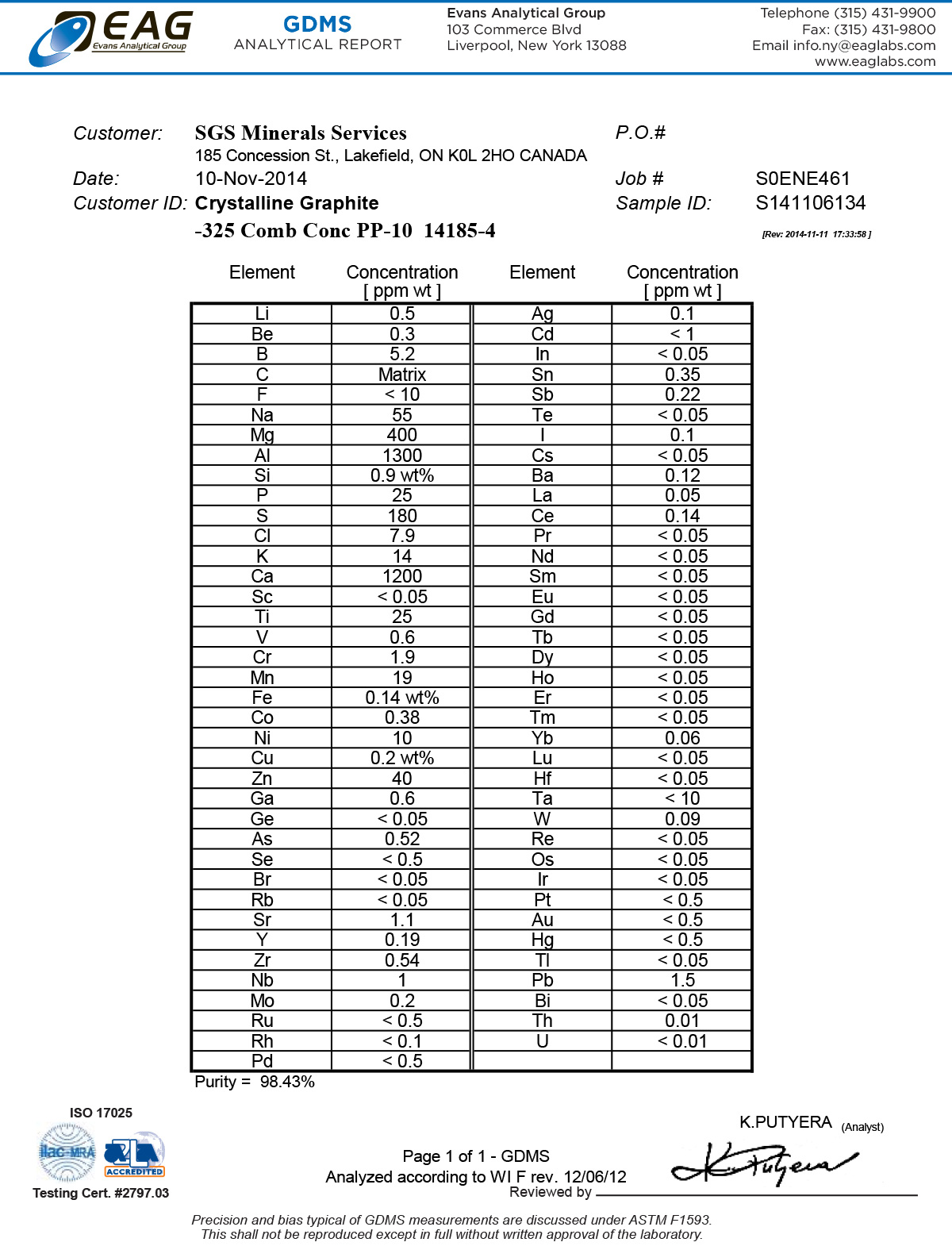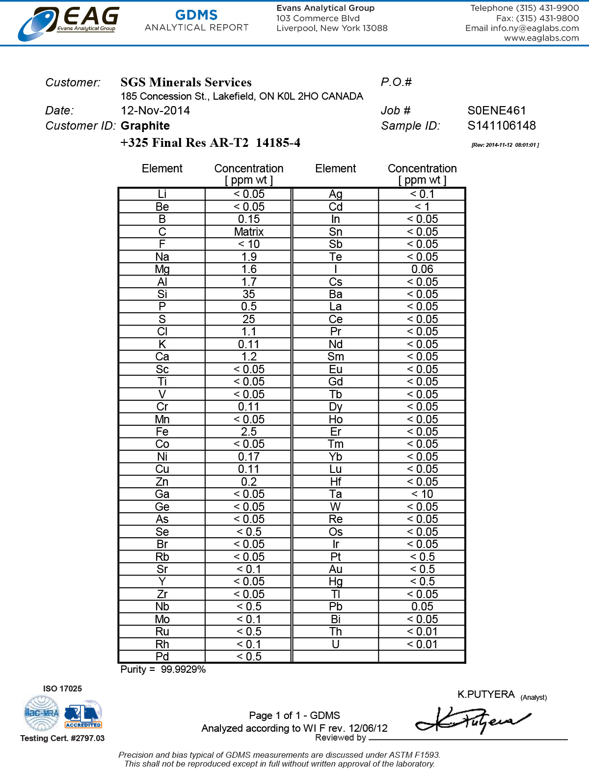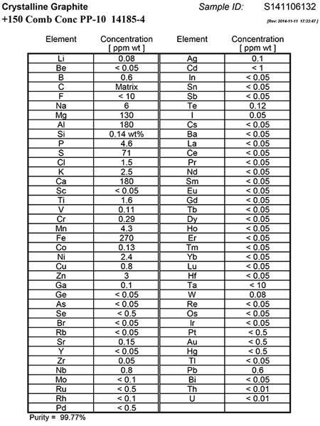 Note: Particle sizes are reported according to Tyler mesh criteria: +48 mesh (>300 microns; jumbo flake); -48/+80 mesh (177 to 300 microns; large flake); -80/+150 mesh (105 to 177 microns; medium flake); -150/+325 mesh (44 to 105 microns; fine flake); and -325 mesh (< 44 microns). 100% of the original sample mass is accounted for in these five particle size categories.