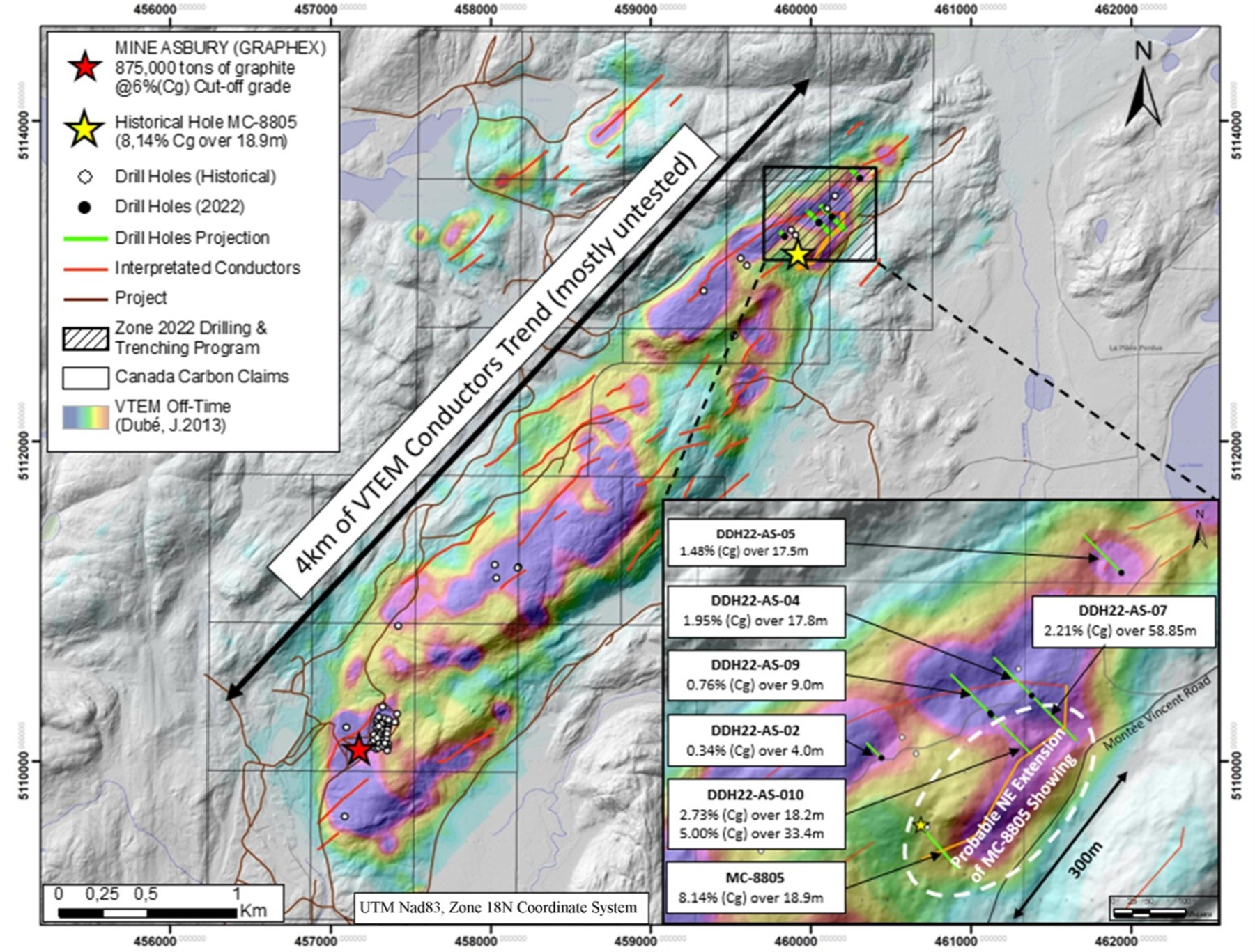 Les résultats de la campagne de forage de l'automne 2022 de la Société ont été tout aussi impressionnants, permettant à CCB de rapporter des résultats à teneur en graphite dans la partie est du gisement allant jusqu'à 2,21% (Cg) sur 55,85 m, dont 9,21% sur 7,25 m dans le trou DDH-AS22-07; et 5% Cg sur 33,5 m, dont 8,57% (Cg) sur 13,5 m (voir la figure 3 et le communiqué de presse daté du 15 février 2023).